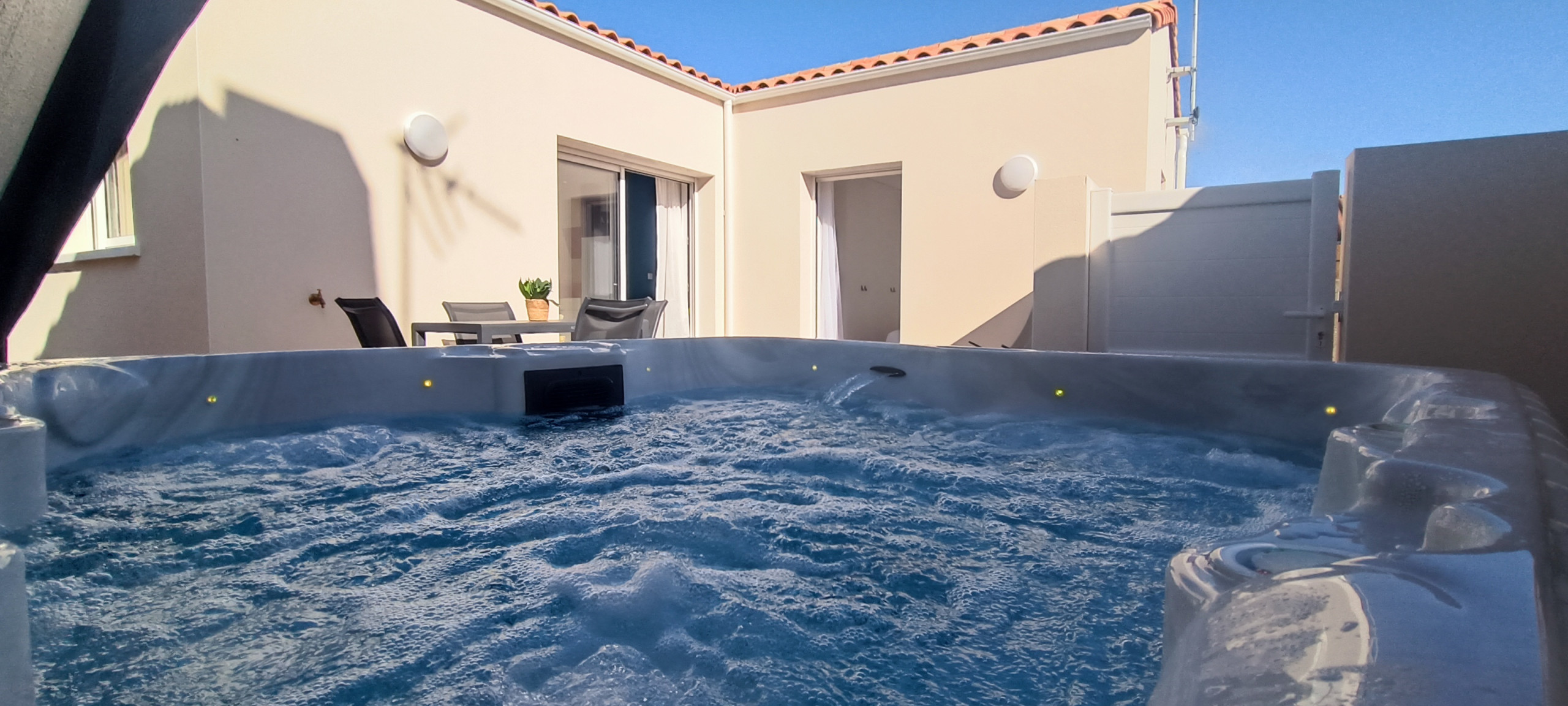 2 living rooms of approximately 25 m², bright and facing full south, each opening onto a fully equipped kitchen: ideal for preparing delicious little dishes after a day of walking. The living room (TV, Wifi) gives access to a pleasant private wooden terrace, without overlooking neighbours, where you will enjoy a garden furniture set and a jacuzzi for moments of pure relaxation 🌷 So there are 2 jacuzzis!