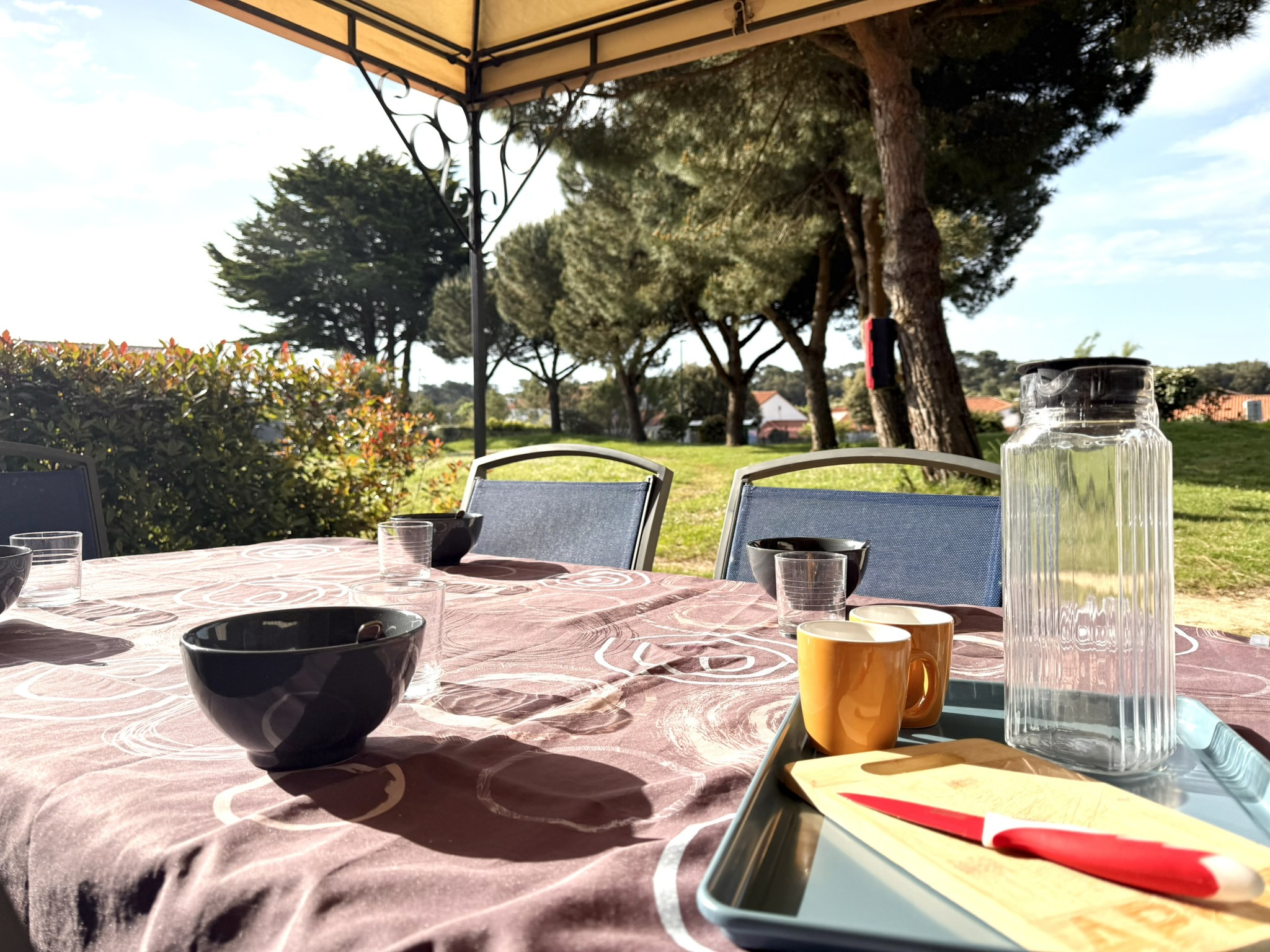 ☀️ South-facing terrace with table, charcoal barbecue and sunbeds, under the pine grove